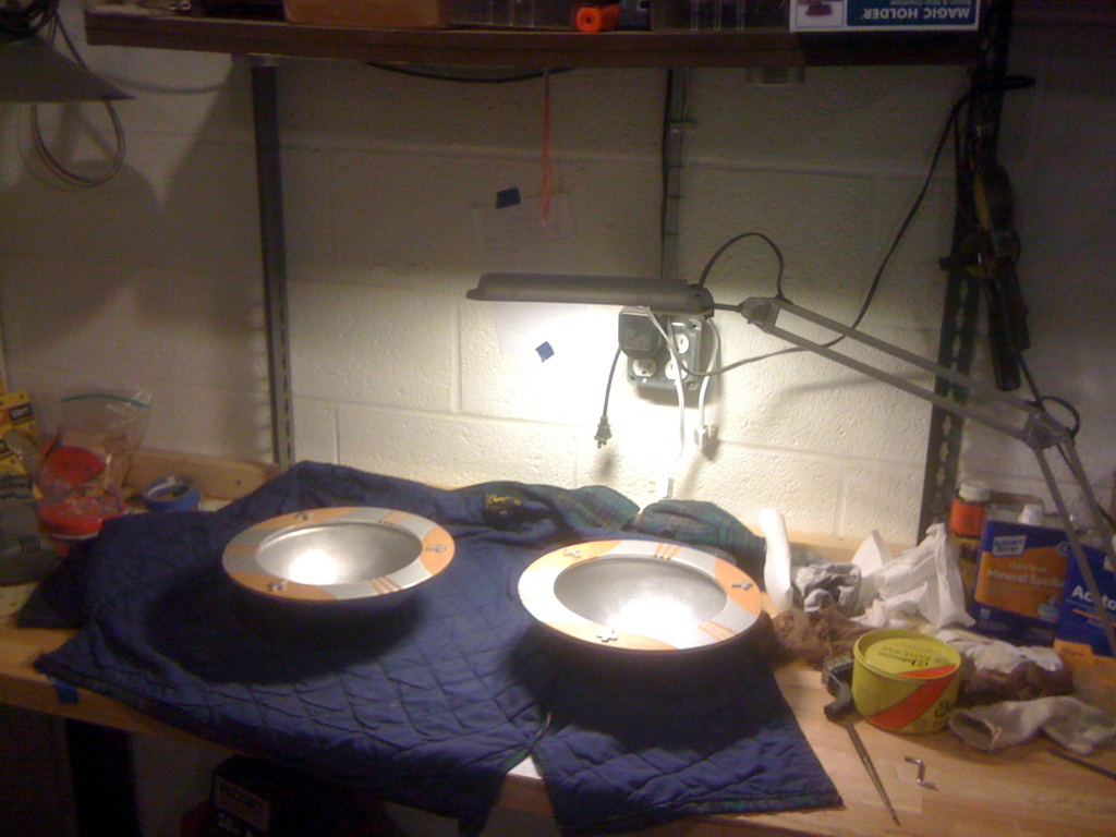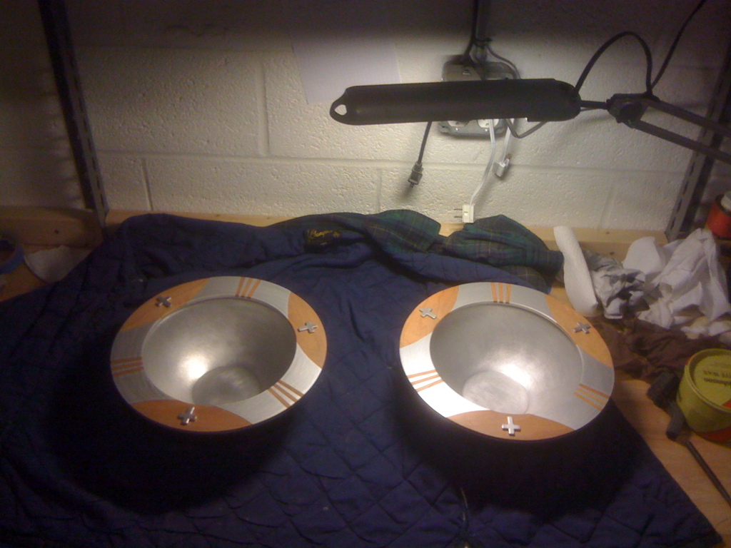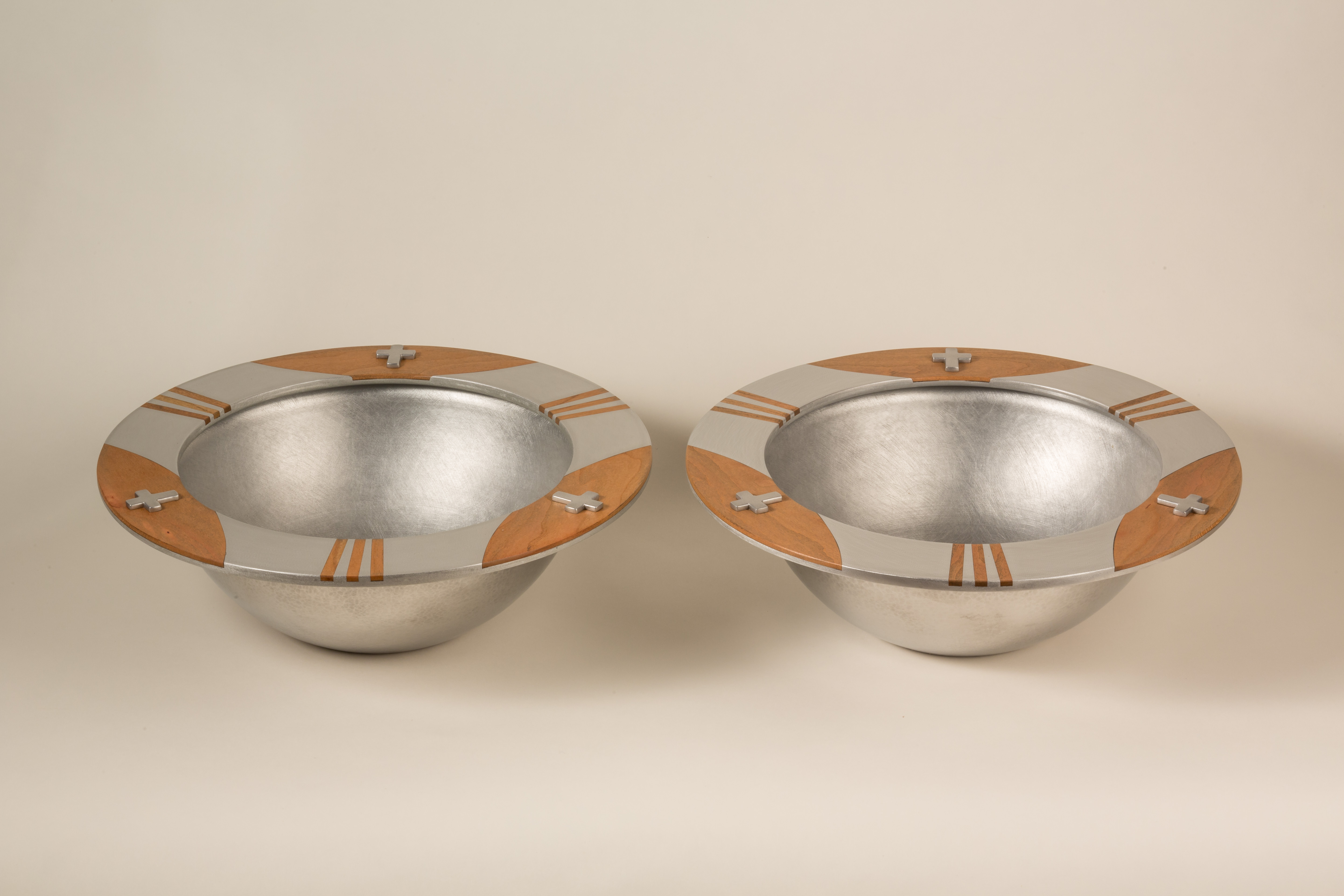 The two part bowls were blind riveted together with hand fabricated aluminum crosses on the front.