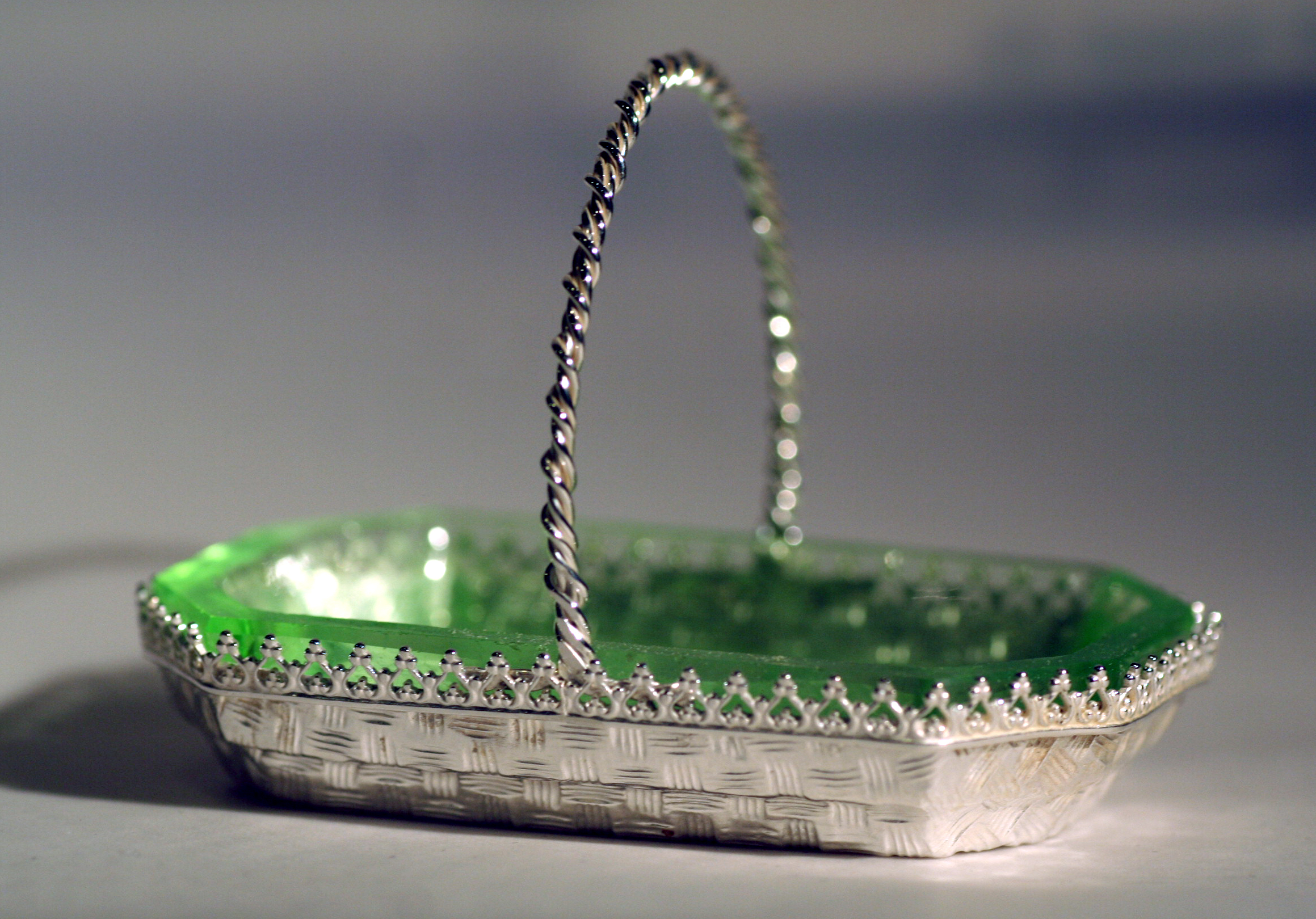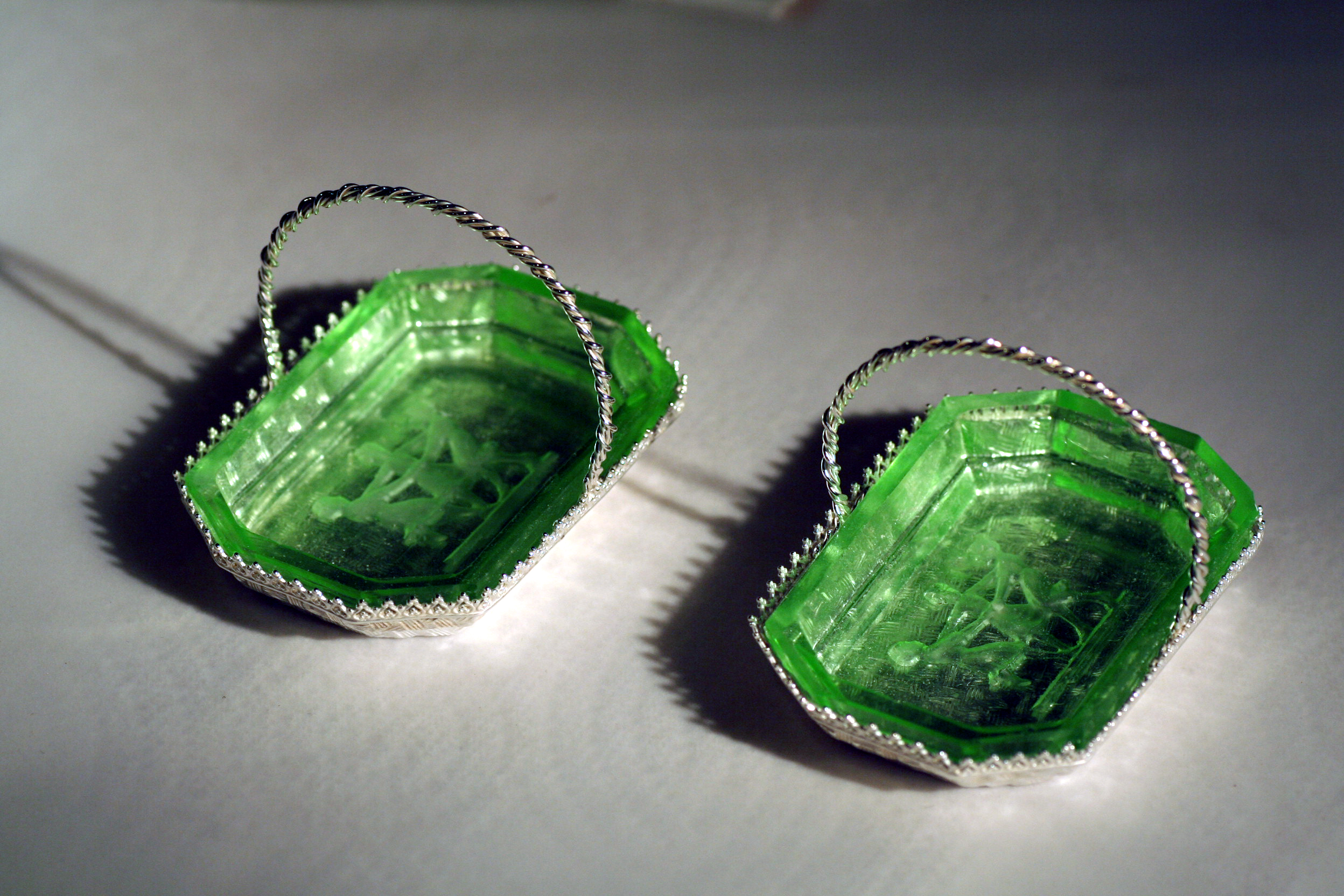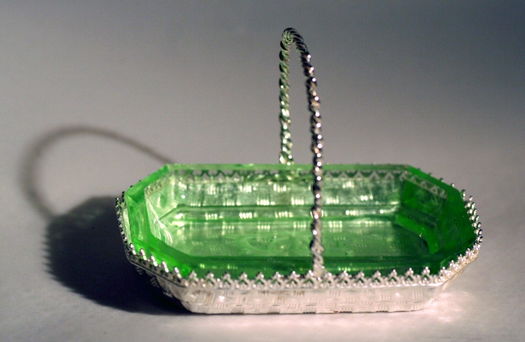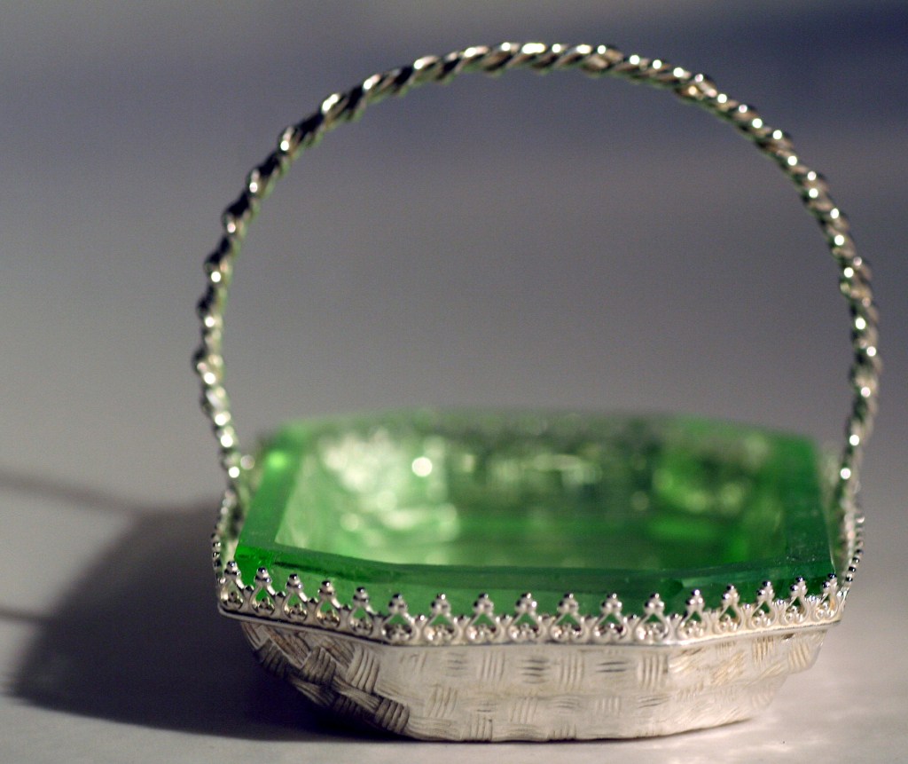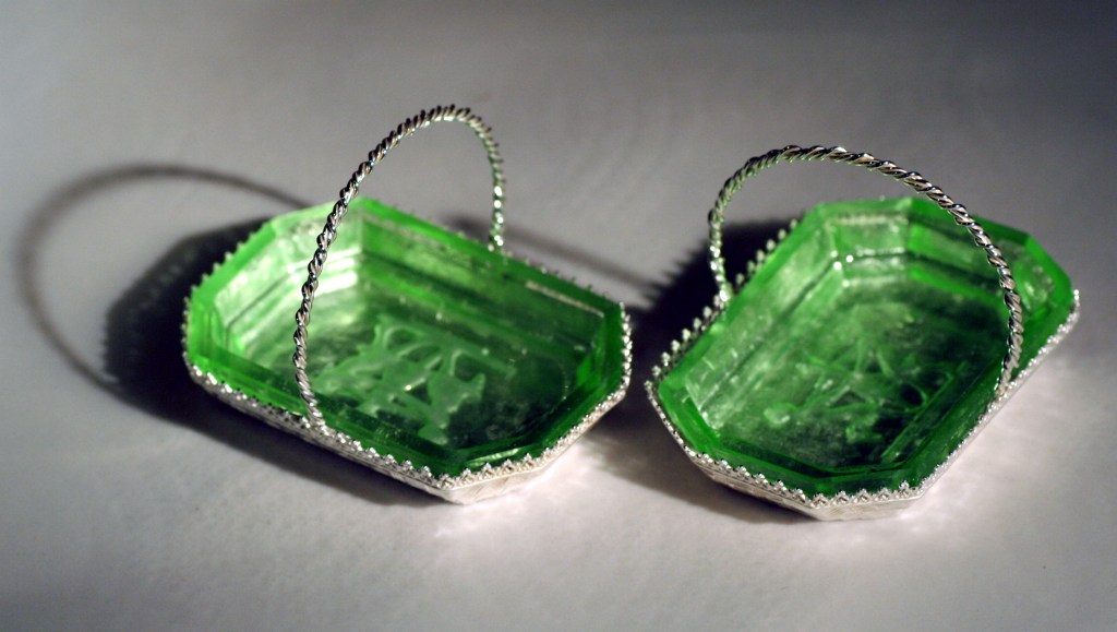 Commission work is a major feature of day to day benchwork – customers often ask if reproductions of lost pieces can be achieved using saved relics. Here a customer was wanting to replace some family silver that was lost to a home fire – the new glass salt cellars were as close a match to the originals as could be found, but did not have the silver trays to carry them. Working with the customer to visualize the original silverware required some archive research; design drafts and final modeling to achieve the desired look. Reproducing the basket weave patterning on the base was a challenge in itself , but with the help of friend and colleague Paula Coupe, we were able to produce a precious metal clay (PMC) patterned weave that was fired into the sheet fine silver, and molded into the final shape using a hydraulic press & custom made mold. The decorative edging and handles were fabricated at a later date.
