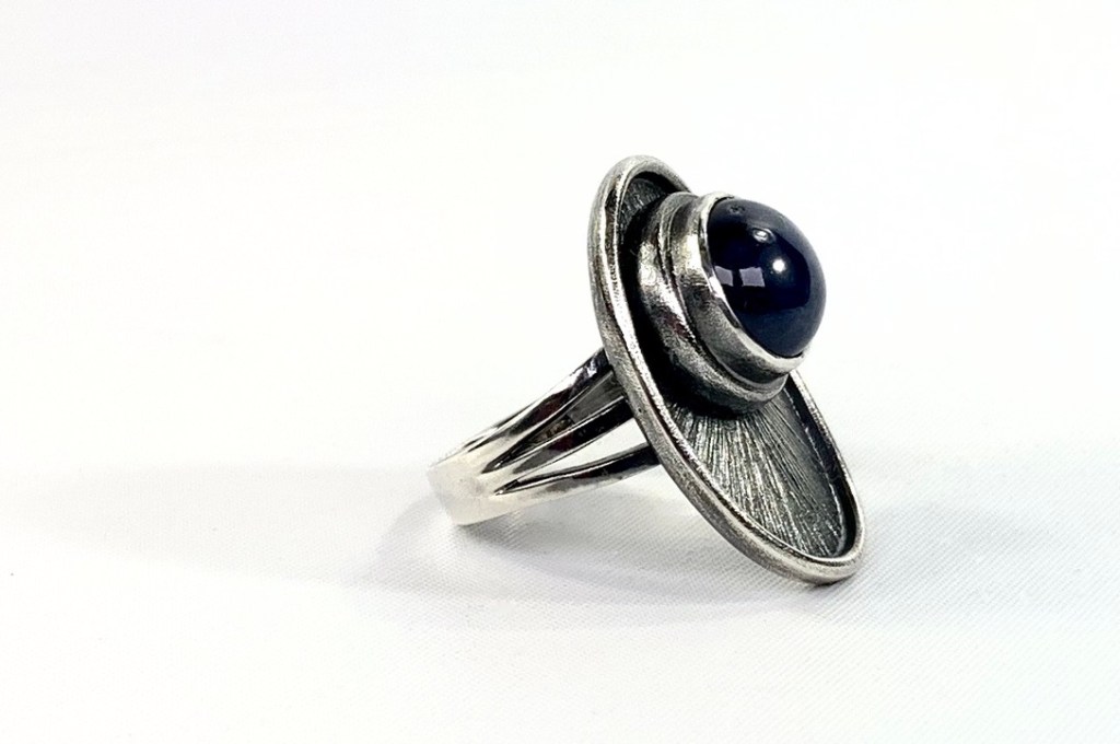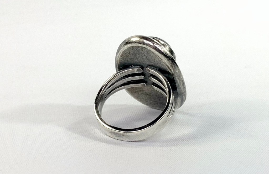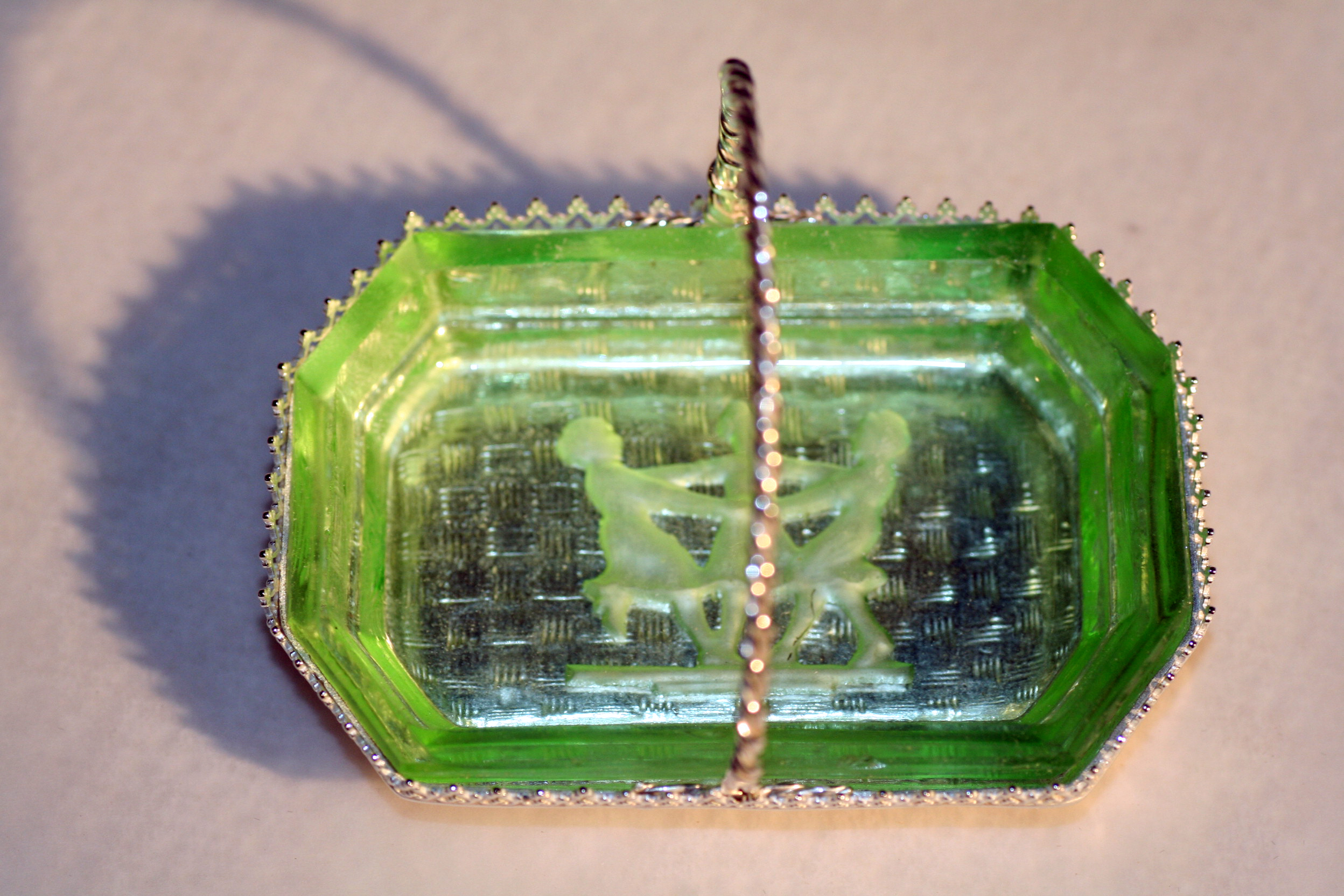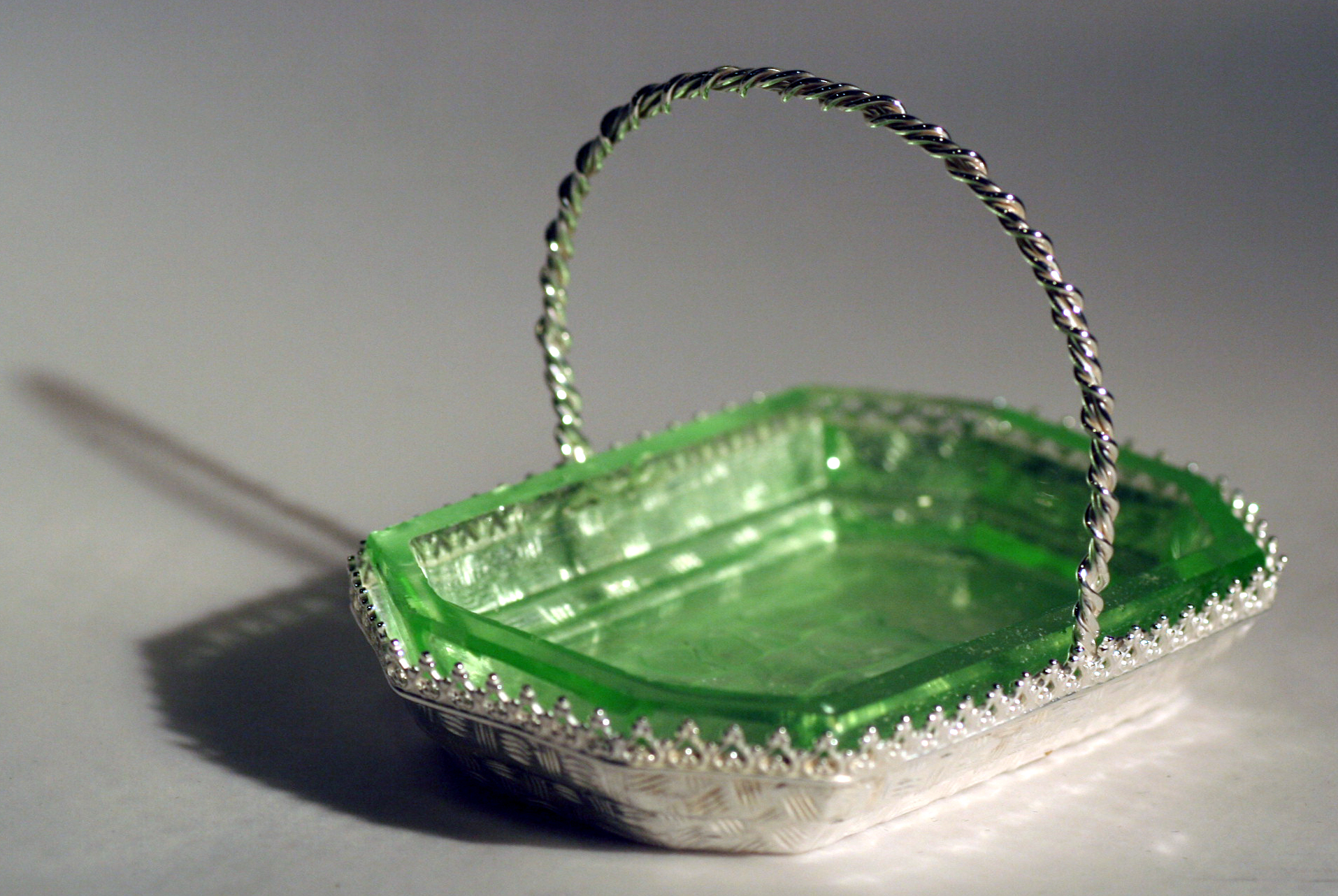 Commission work is a major feature of day to day benchwork – customers often ask if reproductions of lost pieces can be achieved using saved relics. Here a customer was wanting to replace some family silver that was lost to a home fire – the new glass salt cellars were as close a match to the originals as could be found, but did not have the silver trays to carry them. Working with the customer to visualize the original silverware required some archive research; design drafts and final modeling to achieve the desired look. Reproducing the basket weave patterning on the base was a challenge in itself , but with the help of friend and colleague Paula Coupe, we were able to produce a precious metal clay (PMC) patterned weave that was fired into the sheet fine silver, and molded into the final shape using a hydraulic press & custom made mold. The decorative edging and handles were fabricated at a later date.