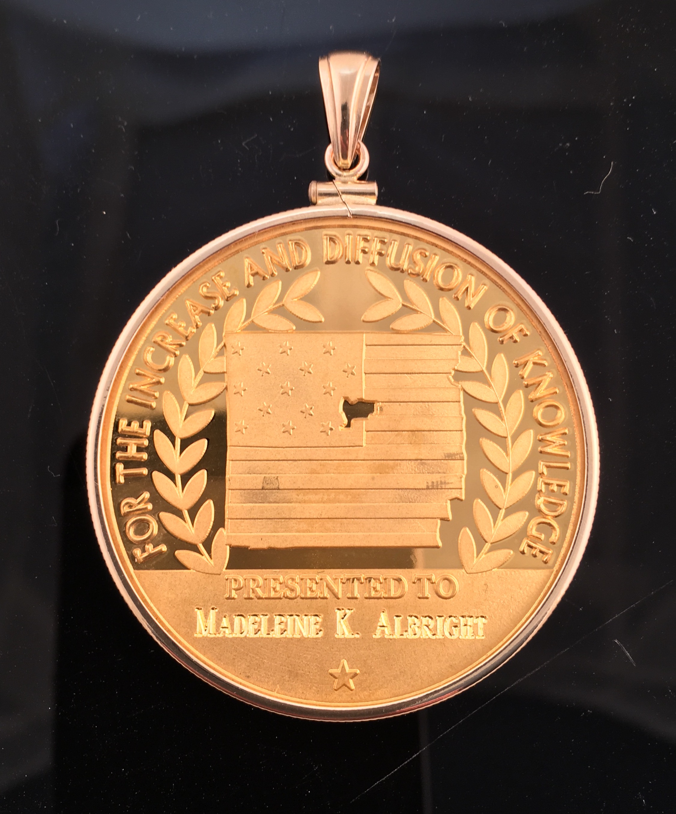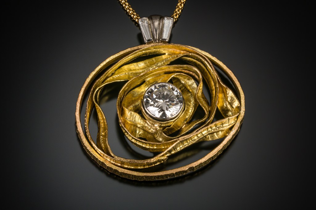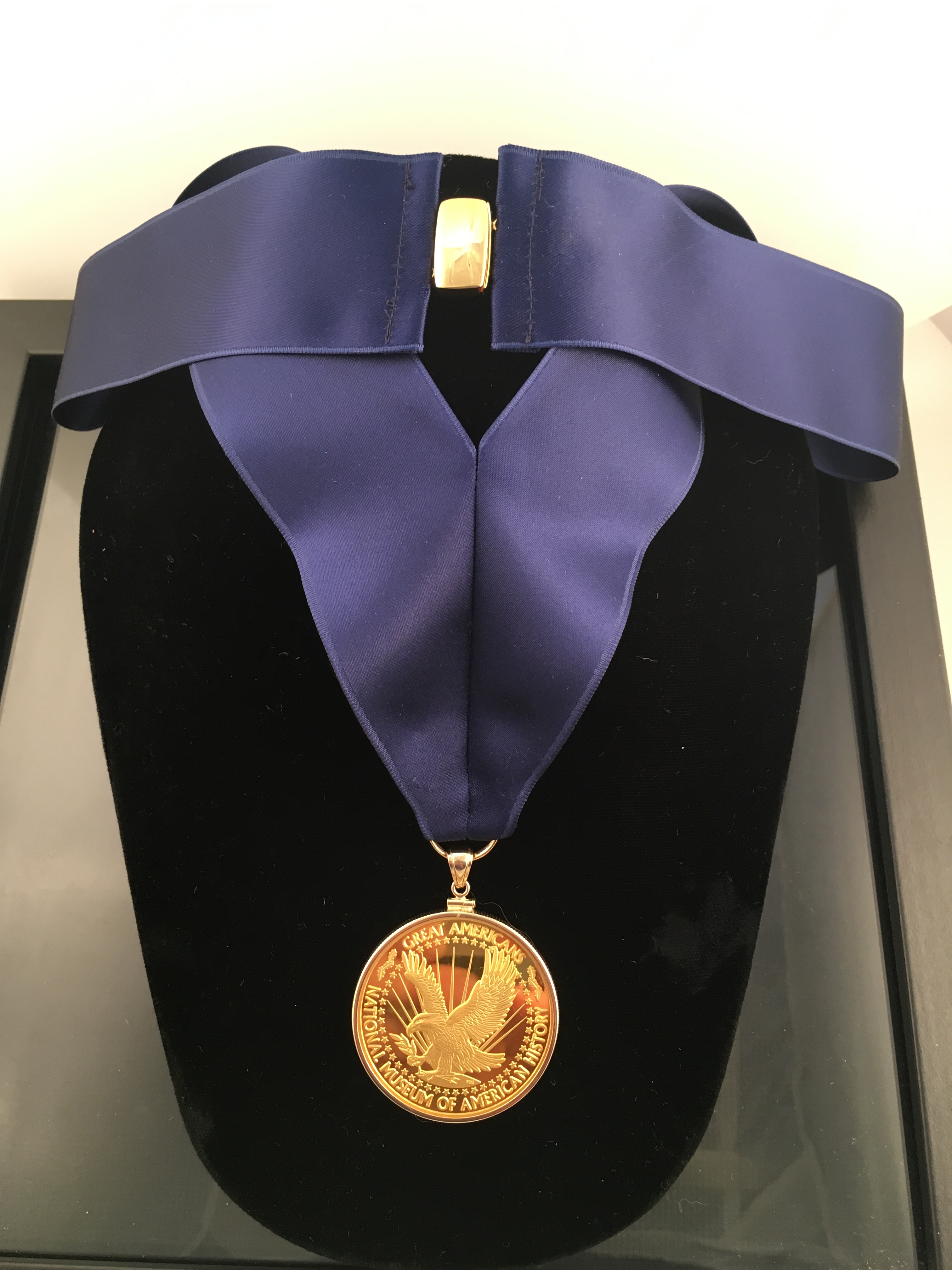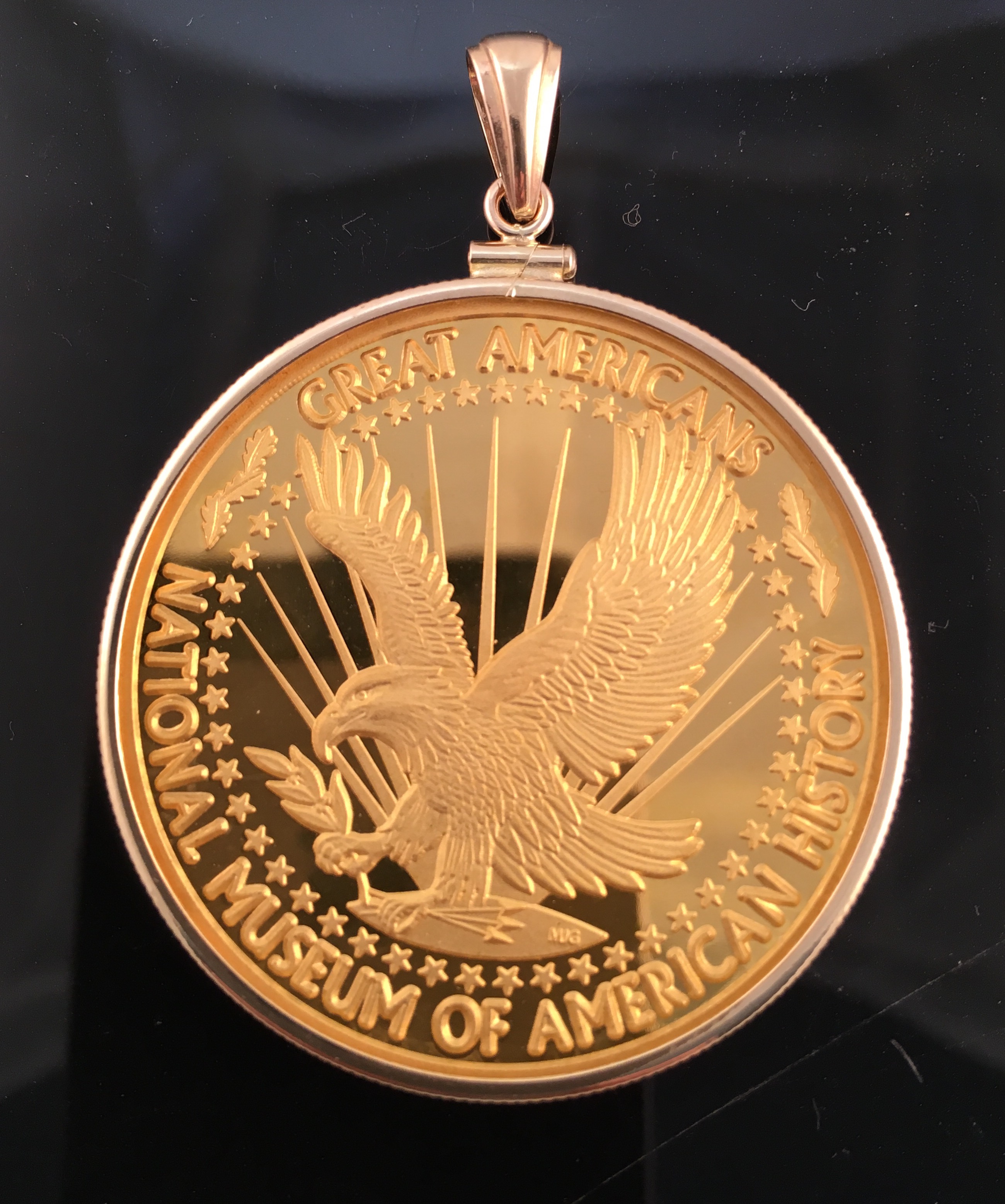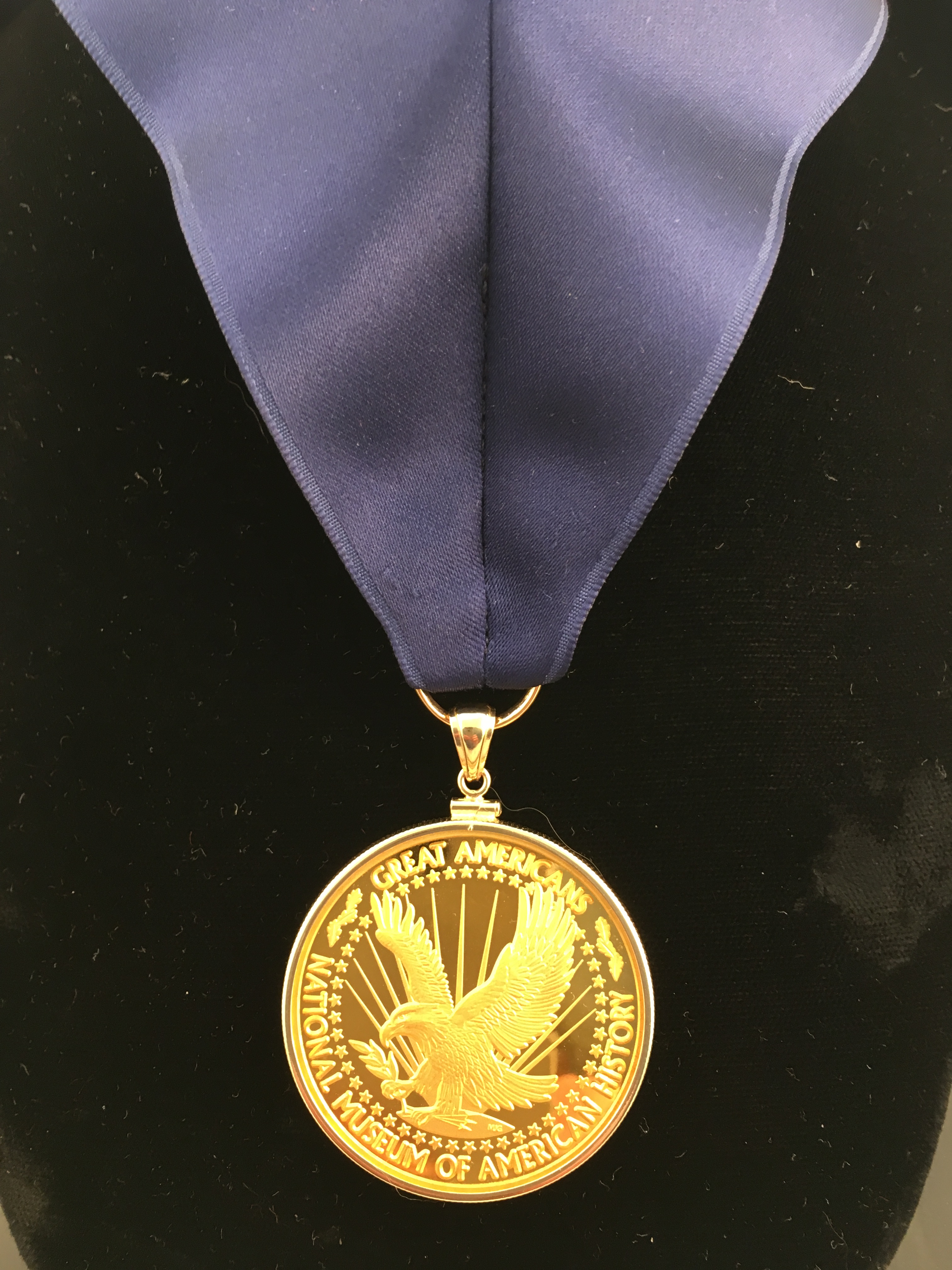 The Smithsonian National Museum of American History approached me to design & mount the coin & clasp for a series of five ‘Great Americans’ 24k medals, they were to award to various dignitaries. The medal was mounted in 14ky frame & bail; the fastening is a magnetic clasp also made in 14ky. The silk blue ribbon was hand cut and sewn. 2016