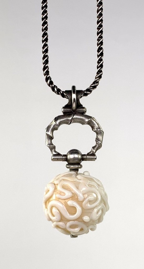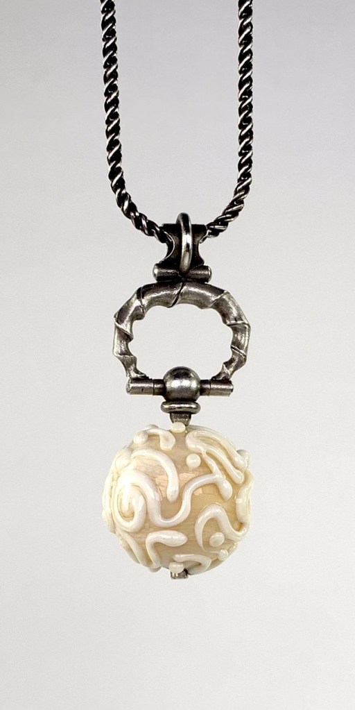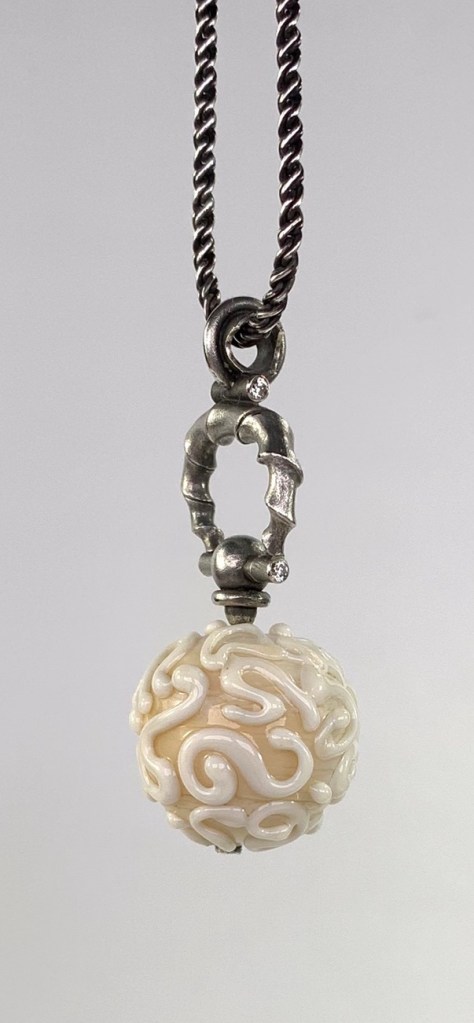 CUSTOMER’S HAND MADE FLAME WORKED GLASS BEAD, WITH DIAMONDS, FOLDFORMED/FORGED 925.