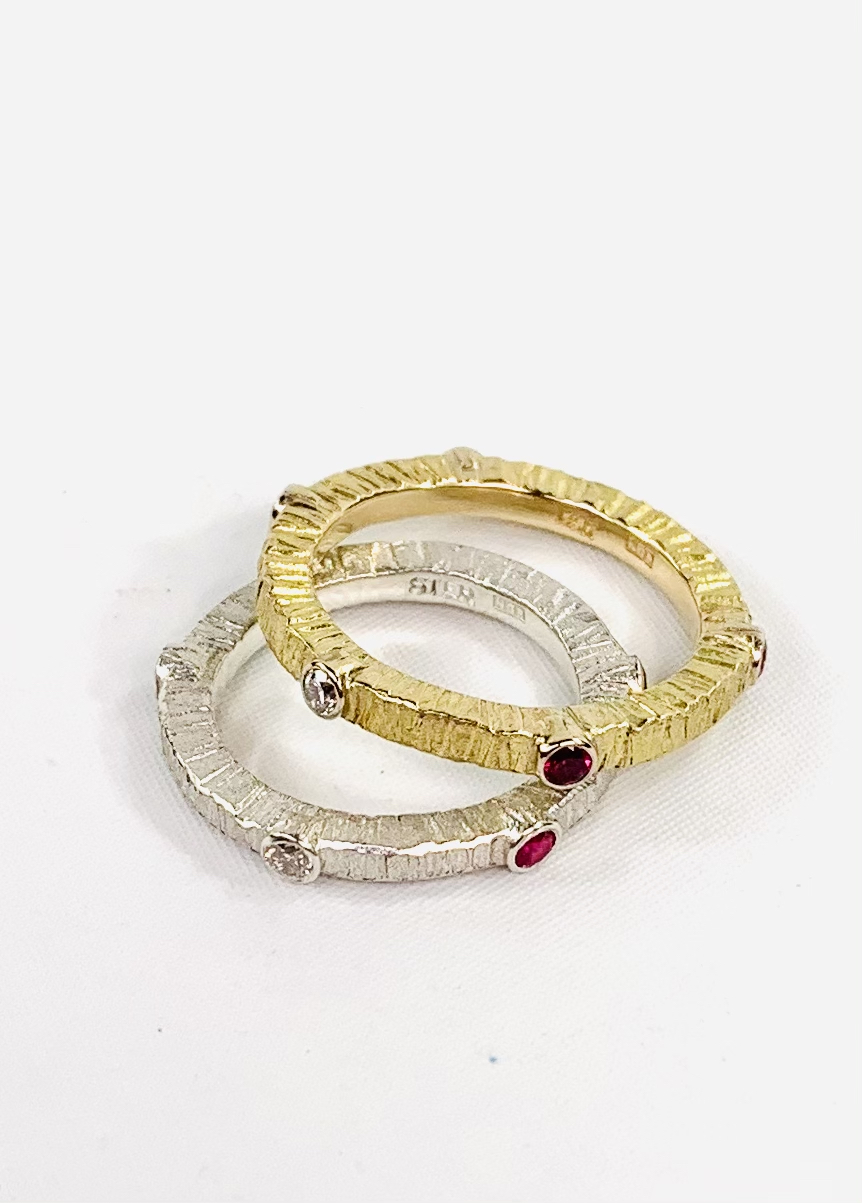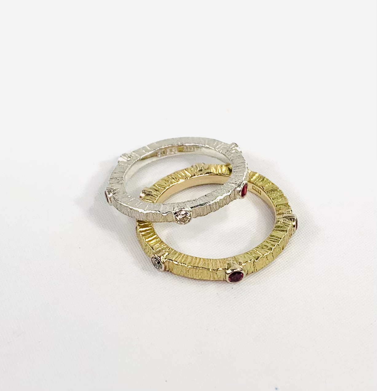 Mother & Daughter eternity rings with diamond & ruby birthstones